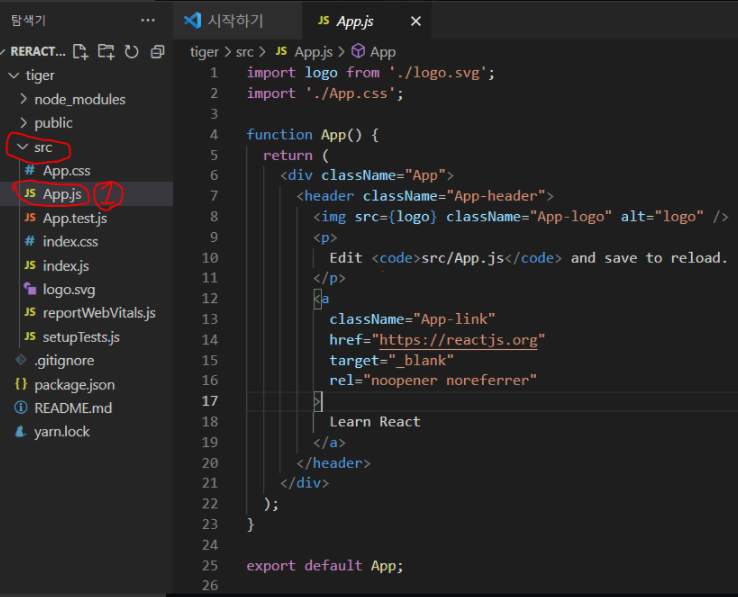 방금 만든 프로젝트명 확인하고 열기 src → APP.js