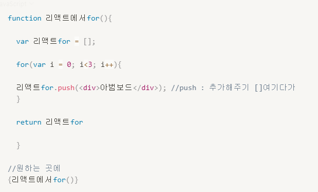 하지만 반복문 for 을 직접 넣을 수 없다. jsx중괄호 내에 for을 못 넣는다.