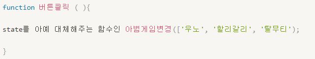 array, object 수정방법은 변경함수를 써야한다는 것 →let [아범, 아범게임변경] 에서 '아범게임변경'을 사용할 것.