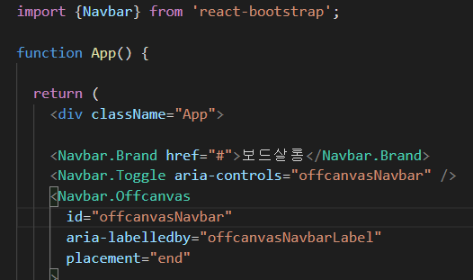 1. React BootStrap페이지에 들어가서 내가 꺼내고 싶은 navbar를 입력하여 맘에 드는 것 하나골라 copy하고 App.js에 붙여넣기를 한다.