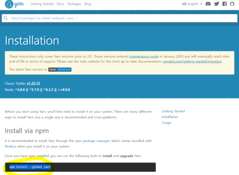 2) npm 대신에 쓸 수 있는 소프트웨어, yarn 을 구글에 검색 yarn