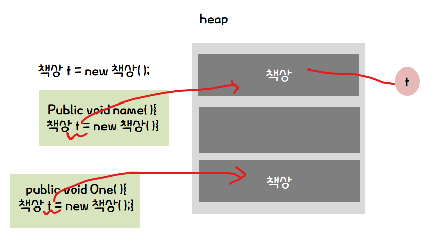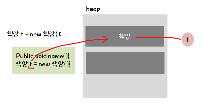 책상 t = new 책상(); new 했기에 실체화가 되는 것이고 (책상을) 그럼 이 주소를 t가 들고 있고