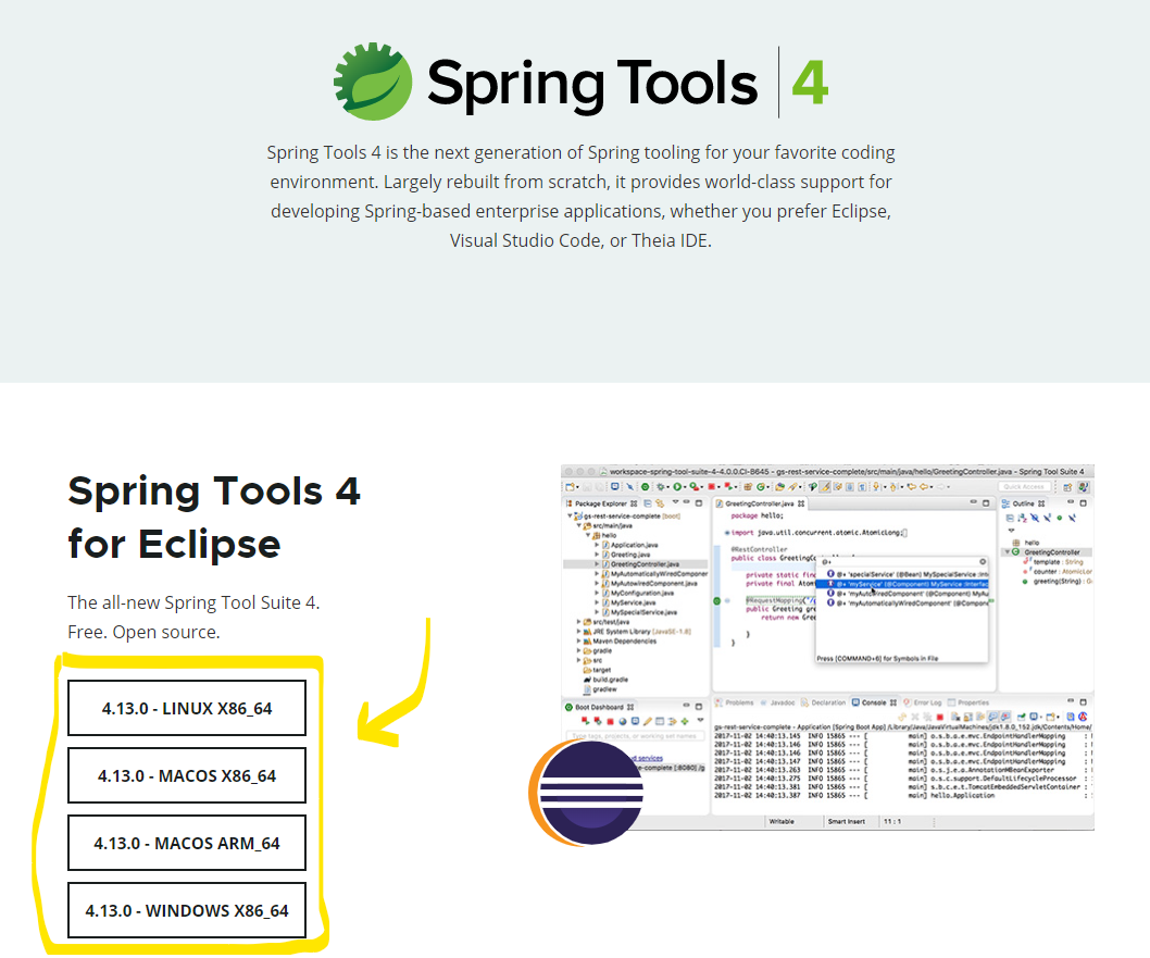 Largely rebuilt from scratch, Spring Tools 4 provides world-class support for developing Spring-based enterprise applications, whether you prefer Eclipse, Visual Studio Code, or Theia IDE.