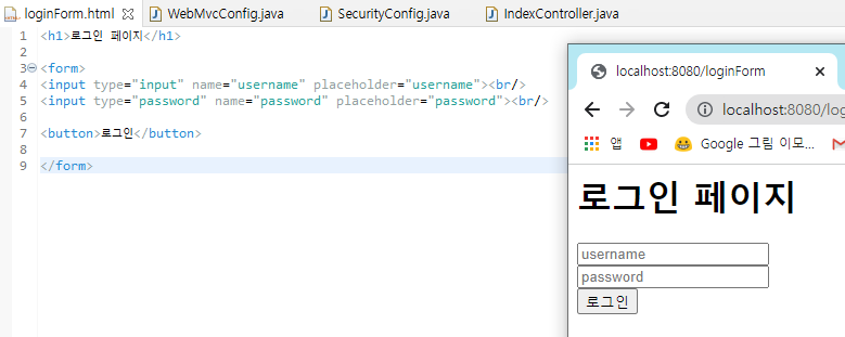나머지는 모두 권한이 허용되어있기 때문에 /login 입력 시 작성한 loginForm.html가 보인