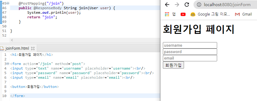 @ResponseBody을 써두었기 때문에 회원가입 시 화면에는 join이 나와야 정상작동,