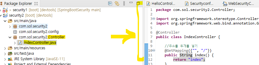 com.sol.security2안에 Controller 패키지 생성하고 IndexController생성