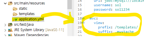 뷰리졸버 설정 시 : templates를 prefix로 잡고 , .mustache를 suffix로 잡아 세팅한다.