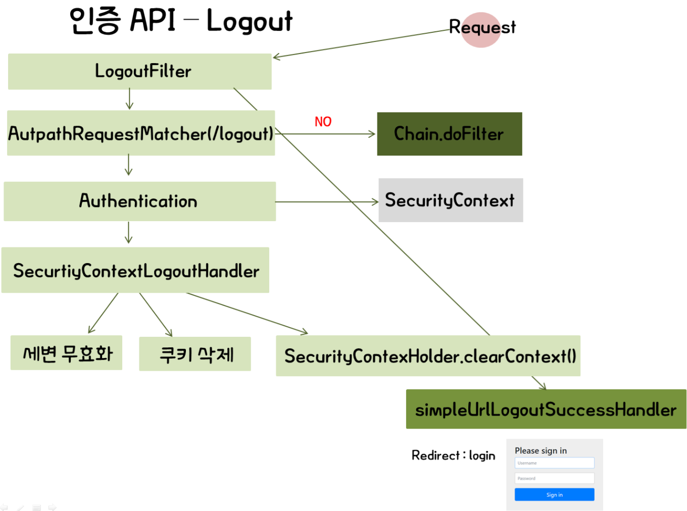 세션 무효화, 인증토큰삭제, 쿠키정보 삭제, 로그인 페이지로 다이렉트로간다.