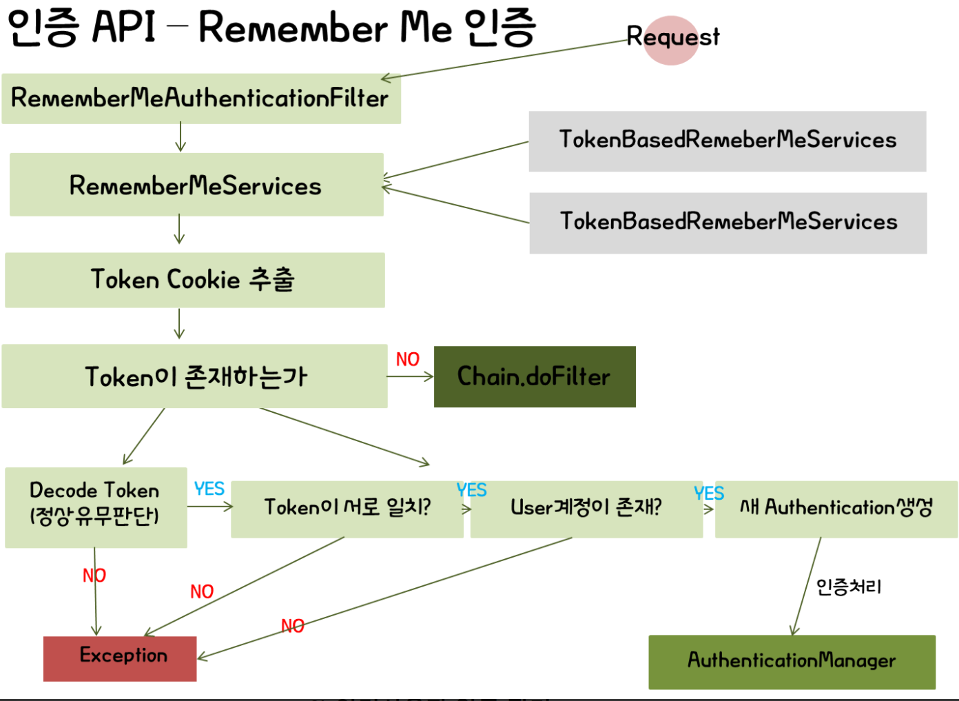 - Remember-Me 쿠키에 대한 Http요청을 확인한 후 토큰 기반인증을 사용해 유효성을 검사하고 토큰이 검증되면 사용자는 로그인 된다.