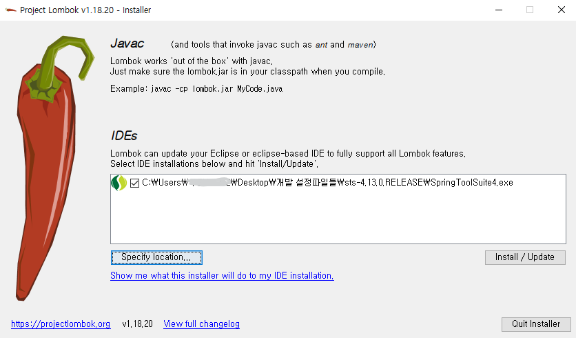 그리고 lombok에 Specify location 클릭하여 사용하려는 IDE의 주소를 찾아 넣어준다.